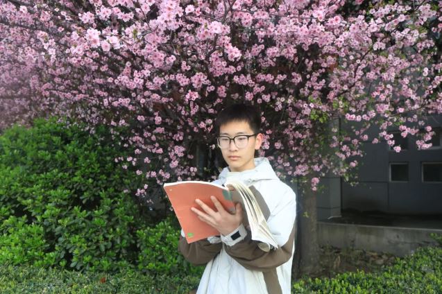 学生在盛放的花树下读书沉思,享受着春天的宁静与和谐。春光不可负,正当读书时。
