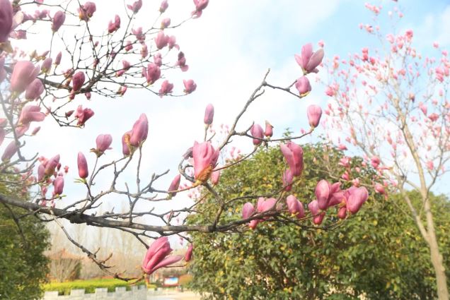 春日轻抚,一叶携春而来的玉兰花在无声中绽放,给校园增添了一道亮丽的风景线。