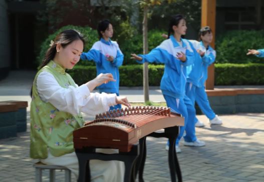 古筝老师轻抚琴弦,古筝的音色深沉而悠扬,宛如潺潺流水,将春天的气息山间的静谧完美地融入歌曲中,让人仿佛置身于翠绿的山林之中。学生们身着整洁的校服,在古筝的悠扬旋律中翩翩起舞,诉说着春天的故事,挥洒着对美的热爱与追求。