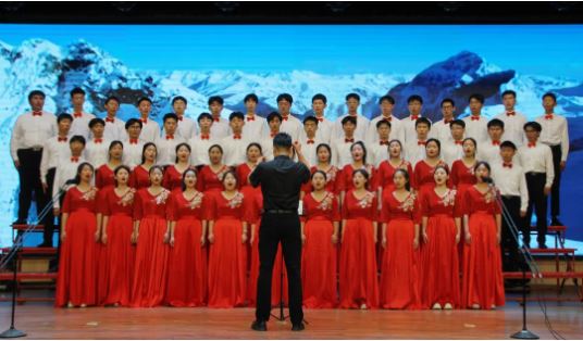 三实验高中合唱团身穿演出服,齐声合唱《天路》,他们的声音汇聚成一股洪流,涌向舞台的各个角落,又扩散开来,将这首经典之作演绎的深情而激昂,赢得了在场观众的热烈掌声。
