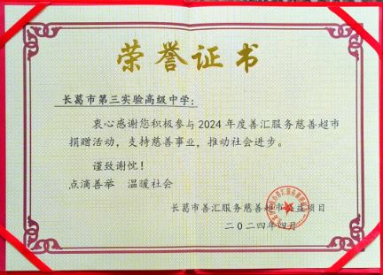 在这个生机勃勃的季节,长葛市第三实验高级中学收到了一份特别的礼物——“2024年度善汇服务慈善超市捐赠活动”荣誉证书。