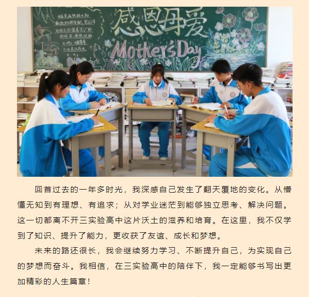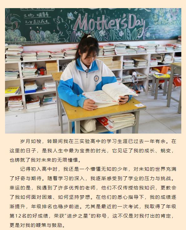在教师篇“我的三高故事”专栏中,我们深入挖掘了长葛市第三实验高级中学优秀德育工作者的先进事迹,展现出他们在德育工作中的智慧与付出。本期开始,我们将开启学生篇“我的三高故事”专栏,邀请学生们分享他们在三实验高中的学习、生活和成长经历。用一则则故事来展现三实验受教育者积极向上的精神面貌。