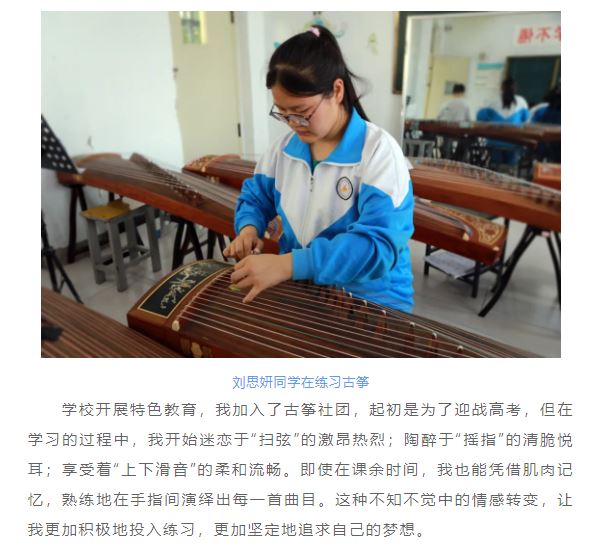 在三实验高中,刘思妍同学不断挑战自我、汲取知识,孜孜不倦的勤奋描绘出她进步的线条,用炽热的心绪谱写出一曲曲梦想与希望的旋律。她用古筝的琴弦勾勒出自己梦想的蓝图,以优秀的表现证明了自身能力。相信未来,她将带着这些宝贵的经历,以更加积极乐观的精神面貌,继续书写属于她自己的充满无限可能的精彩人生篇章!