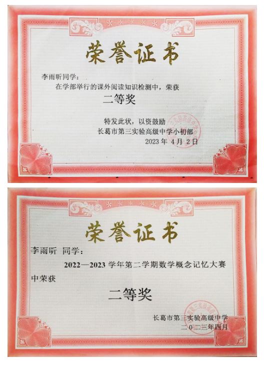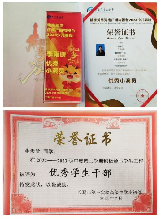 李雨昕品学兼优,积极参与各项活动并荣获多项荣誉,成为大家学习的楷模和典范。