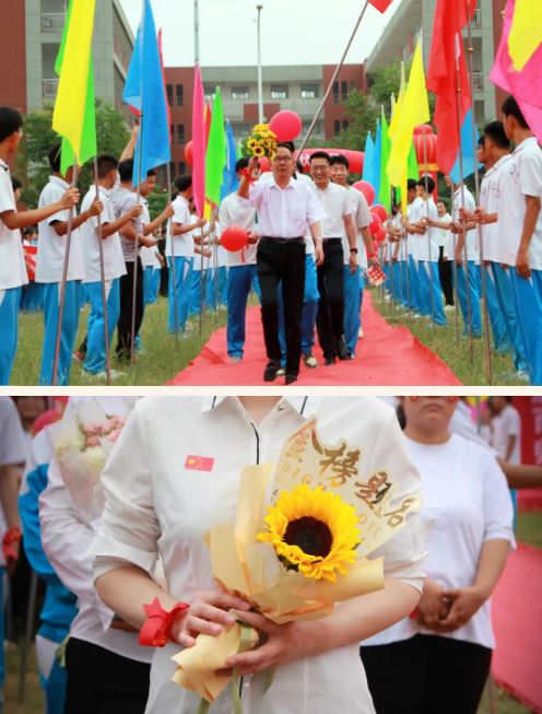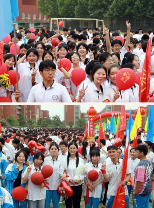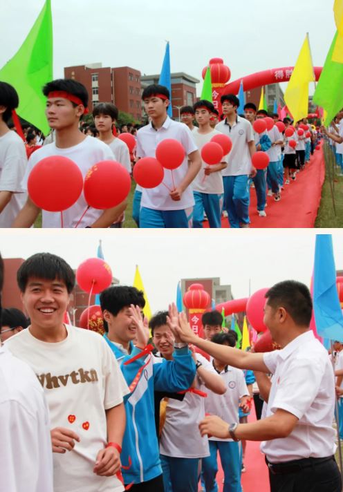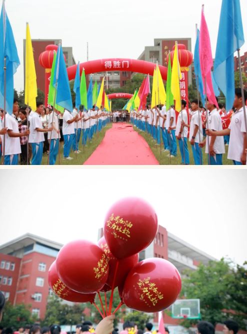 在高一、高二年级学生的助威声中,高三学子们以班旗为引导,昂首阔步,穿过状元门,意为一举夺魁,跨过得胜门,意为旗开得胜,学校领导组与学生一一击掌助威,一击必中。