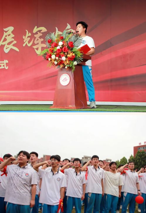 高三(5)班学生马春豪带领全体高三学子进行宣誓,他们的誓言铿锵有力、掷地有声,传达出决胜高考的坚定信念和勇往直前的决心。