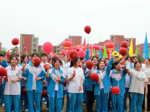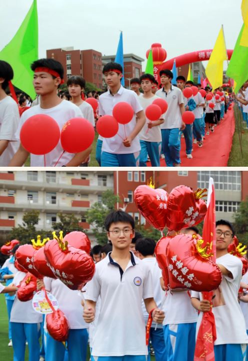 高一、高二年级的学弟学妹们则在田径场列队,手持红色小国旗和气球,用热烈的掌声和欢呼声为他们加油助威!