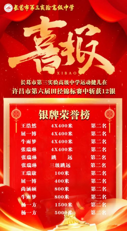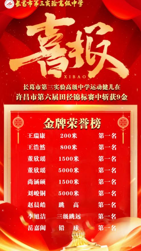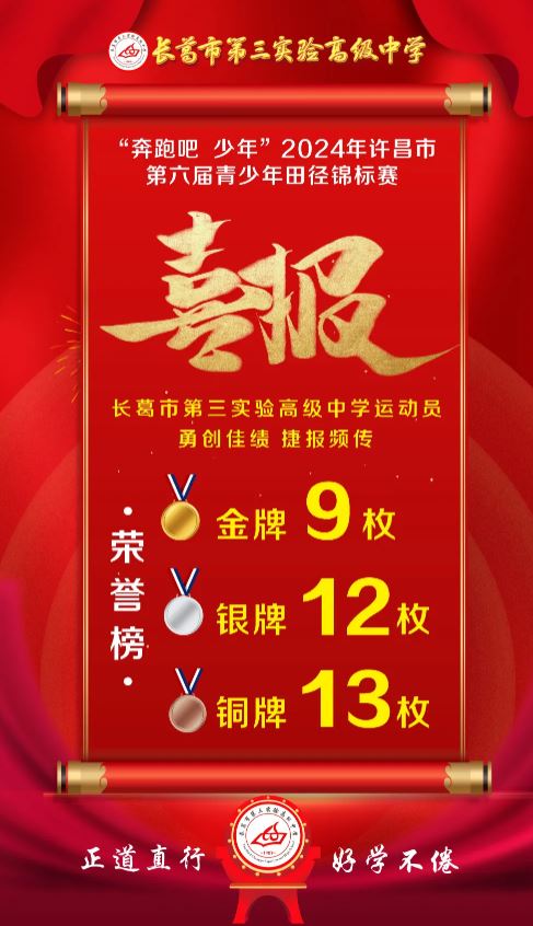 6月29日—30日,许昌市第六届青少年田径锦标赛火热进行中,长葛市第三实验高级中学运动员们以出色的竞技实力和顽强的拼搏精神,勇创9金12银13铜的辉煌战绩。