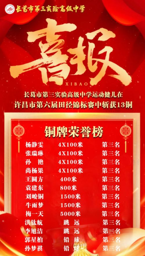 此次在许昌市青少年田径锦标赛中取得优异成绩,是对学校竞技体育特色教育成果的肯定。长葛市第三实验高级中学将继续坚持发展竞技体育特色教育,让更多心怀体育梦的学子通过体育赛事成为国家级运动员,升入更好的大学深造,为国家培养更多高质量的运动员做出贡献!