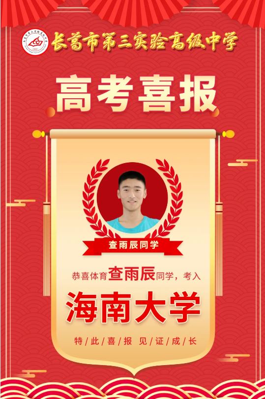 长葛市第三实验高级中学2024届高三毕业生查雨辰同学被“211“工程大学海南大学录取。