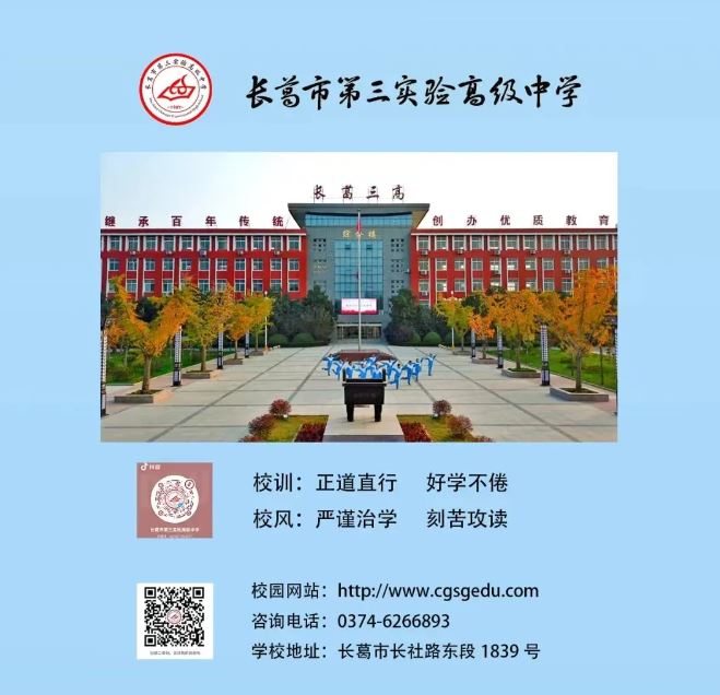 顾校长强调,长葛市第三实验高级中学秉持因材施教、成就人生的办学宗旨,强化艺术特色办学方向和思路,满足学生个性化发展需求,给每一名学生提供更多发展及圆梦大学的机会!关爱、鼓励每一位学生,通过家校协同、五育并举的措施,再结合有效管理、高效课堂,努力培养学生勤学乐思、吃苦耐劳的优良品质,提升学生综合素养,找到正确的赛道,彰显自身风采!