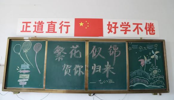 “繁花似锦 贺你归来”教室里教师们制作了漂亮的板报,正是热烈欢迎同学们归来的情感表达;储物柜干净整洁,等待同学们来填满,每一处都表达了教师们期盼学生归来的热切心情。