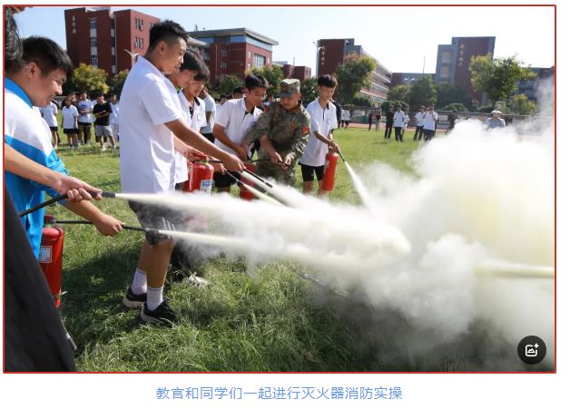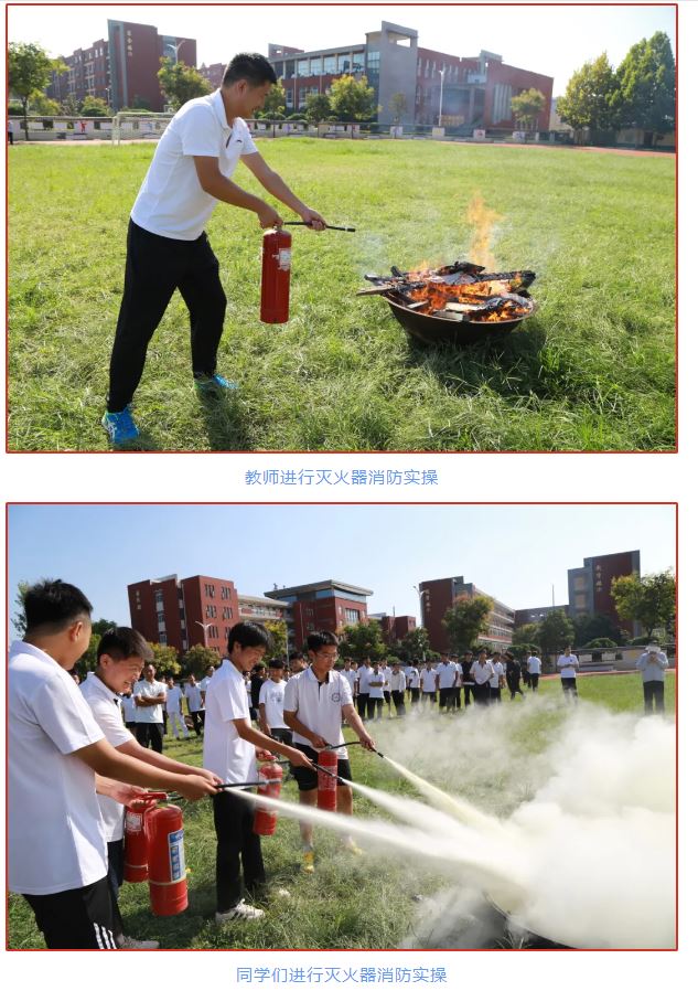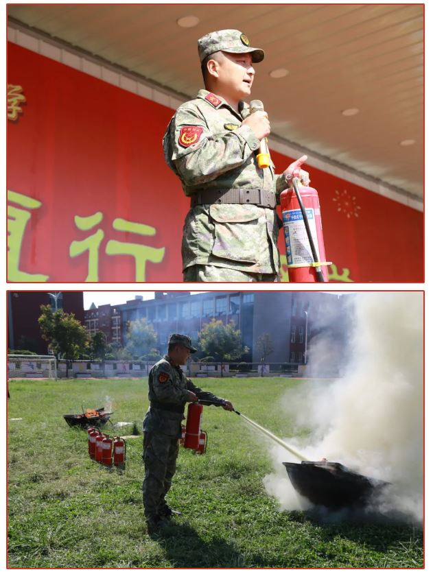 同学们在田径场迅速集合完毕。消防教官为同学们讲解预防火灾的安全知识和灭火器的使用步骤:提、拔、握、压、喷;并现场做了演示。同学们积极参与其中,进行实操演练。