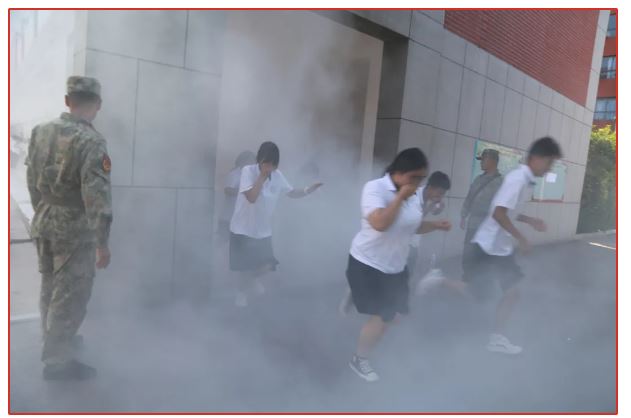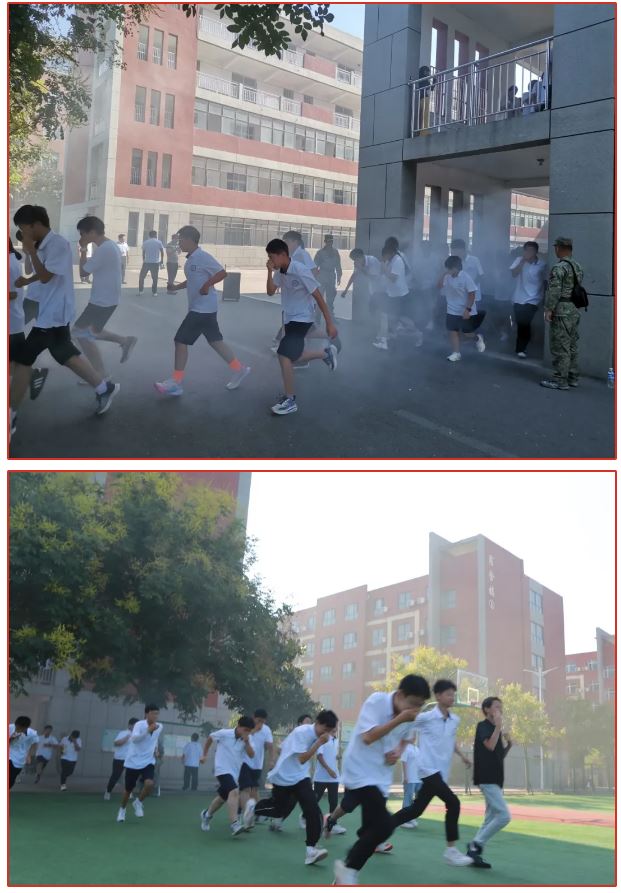 教学楼模拟火灾事件点发生大量烟雾,随着警铃响起,全体教官、班主任、任课教师迅速到达指定岗位,按照预先规划,引导同学们安全有序撤离教学楼。