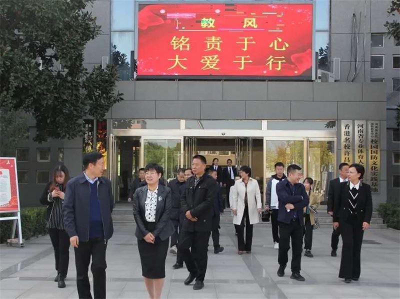 2020年10月21日上午9点,我校迎来了许昌市人大教科文卫工委主任党俊红一行7人,以及长葛市人大副主任袁兰章、长葛市人民政府副市长薛红军、长葛市人大教科文卫工委主任刘瑞红、长葛市教体局局长陈超宏等领导莅临我校开展高中阶段教育质量提升情况调研工作。校董事长兼总校长郭晓丽女士、高中部校长李小刚、高中部副校长杨进辉、高中部副校长杨柳、高中艺术部副主任张红旗陪同。