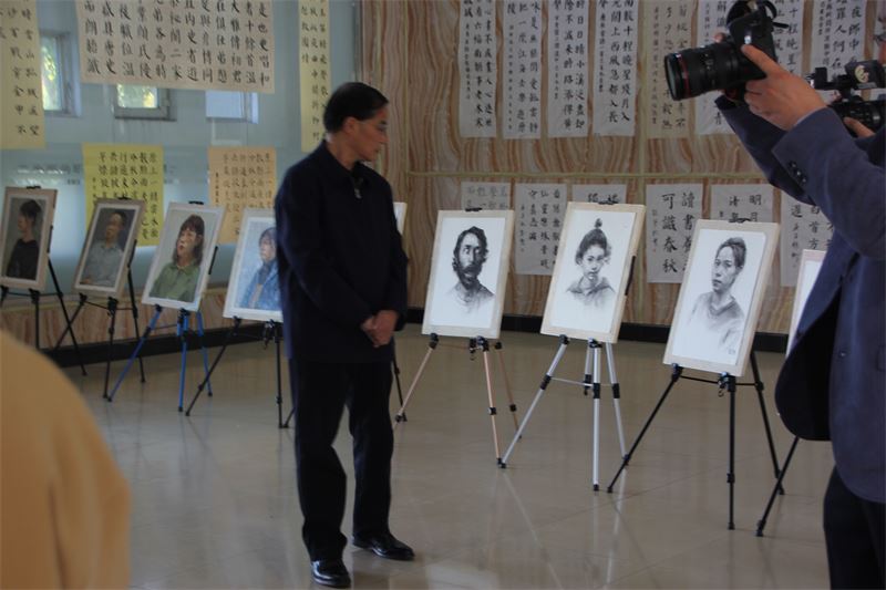 视察组领导到我校行政楼大厅实地考察学校毕业生优秀书画作品。