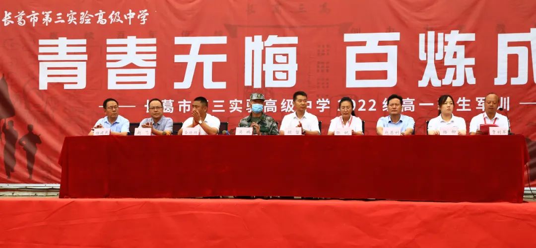 红旗招展书写凌云壮志,脚步铿锵展示青春风采。2022年8月25日上午,长葛市第三实验高级中学在田径场隆重举行了2022级新生军训开营仪式。开营仪式由高一年级主任贾利军主持,总校长顾留、参训总教官吴鹏、副校长张帆、副校长查晓辉、副校长赵飞、副校长杨柳、副校长杨建民、立兴职业高中副校长赵恩利,以及高一年级各班班主任和全体学生参加此次开营仪式。