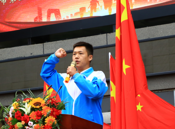 为激发每位学生的责任感、荣誉感和归属感,形成强烈的向心力与凝聚力,全校学生在高三(9)班王阳同学的带领下齐诵誓词: