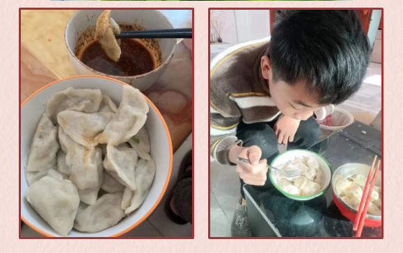 忙碌过后,一碗碗热气腾腾、香气四溢的饺子摆满了桌子,一盘盘裹着爱意的饺子饱含了同学们劳动的自豪与喜悦。这次成功的劳动体验背后有着每一位同学的认真与努力,也离不开各位家长的潜心教导。一盘盘氤氲着热气的饺子,抵御了严冬凛冽的寒风,在每个人的心中都留存一丝余温!