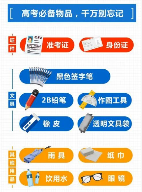 出门前认真检查要带的物品,如:身份证、准考证,水笔、2B铅笔、三角板、圆规、橡皮、量尺等,把以上所有装在结实、厚而透明的小塑料袋里,每天出发前,对照清单,检查一下。清单等非考试用品不能带入考场。不能用涂改液或修正带等。