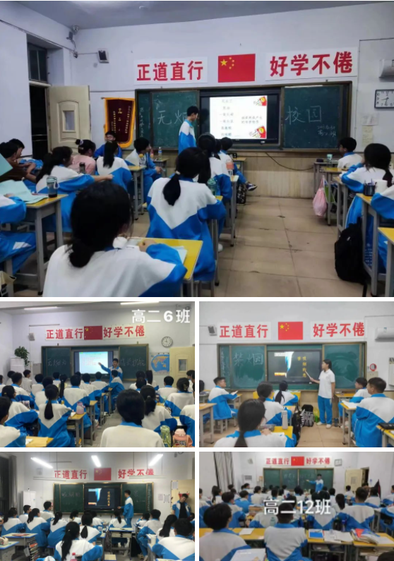 为强化教育效果,各班级开展了控烟主题班会,班会课上,各班老师首先向本班学生讲解了世界无烟日的来历、吸烟的危害、戒烟的简单方法等知识,并告知同学们烟草是造成人类死亡的第二大原因,全球大约有一半吸烟者最终死于吸烟所导致的疾病,青少年更是其中受害严重的群体。通过讲解,学生深刻认识到吸烟的严重危害性,从而敲响警钟还家庭与社会一个美丽而清新的天空,与健康永远相伴。