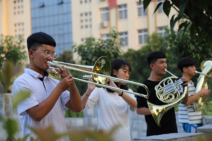 我校管乐团创建于2018年,由全国知名音乐家王文馨教授及其教育团队亲自授课,授课乐器类型有:小号、次中音号、圆号、长号、大号、单簧管、长笛、萨克斯、打击乐。多名同学通过管乐考上心仪的大学,其中李昂同学被华中科技大学录取;刘超同学被南昌大学录取;刘开源同学被郑州大学录取等。