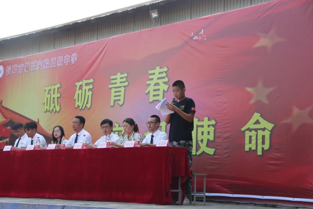 高一(1)班刘广源代表学生发言,他分享了这几天军训的感悟和收获,表达了对教官的感谢和留恋,同时表示在以后的学习中将继续发扬军训期间所展现的顽强拼搏的意志和吃苦耐劳的精神。