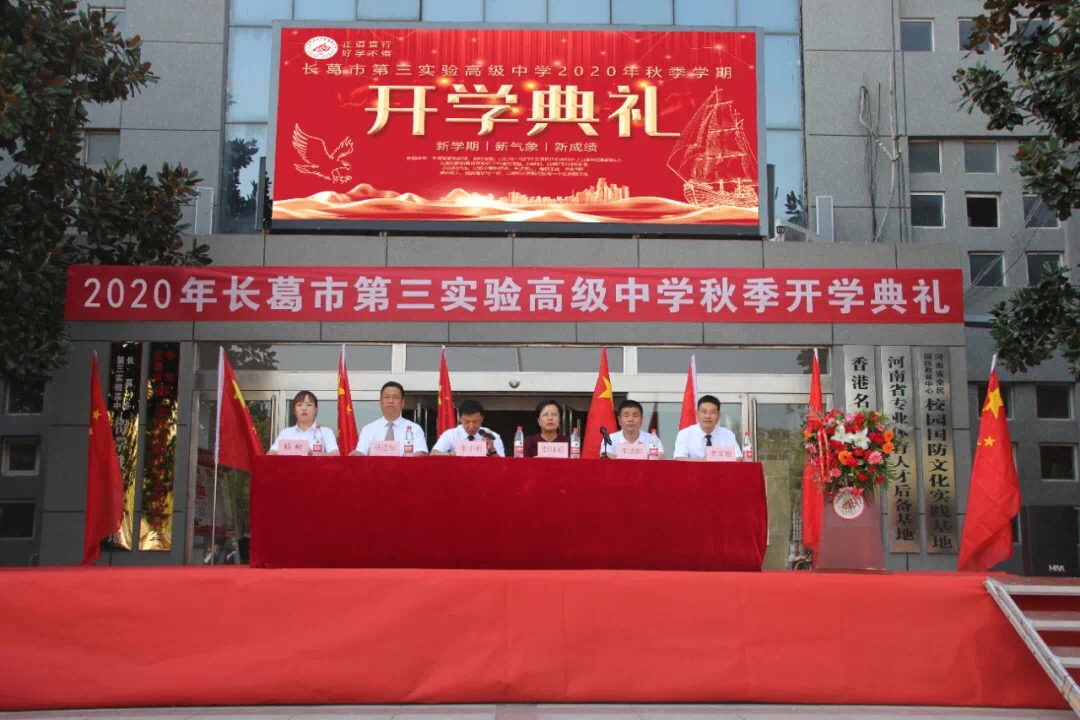 2020年9月8日上午,长葛市第三实验高级中学在校前广场举办了秋季学期开学典礼。与会领导有:校董事长兼总校长郭晓丽女士、高中部校长李小刚、初中部校长李洪麟、小学部校长黄军恒、高中部副校长杨进辉、高中部副校长杨柳,高中部校长李小刚主持了本次典礼。