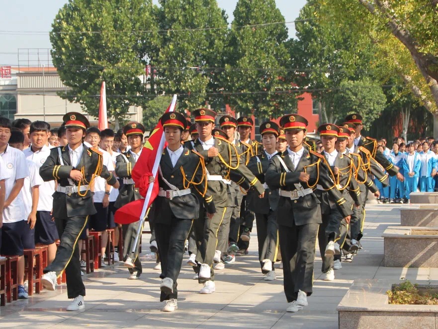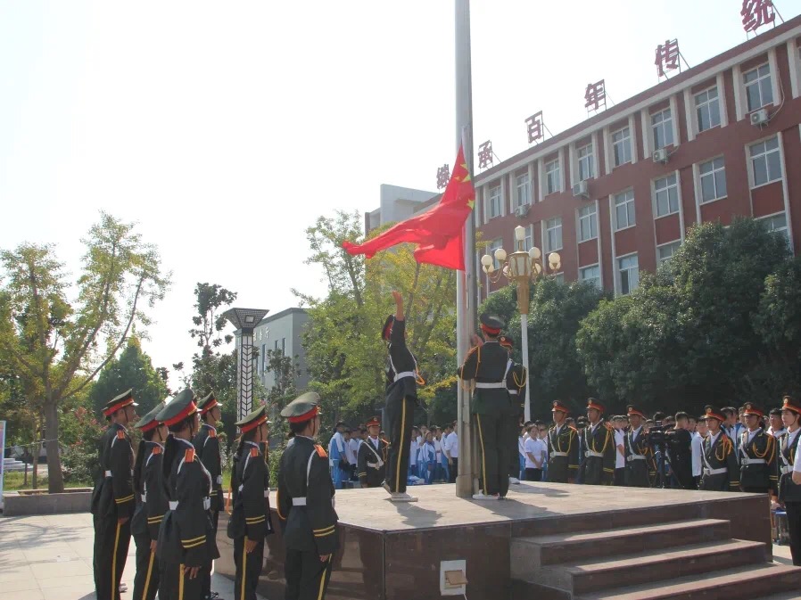 校国旗护卫队昂扬行进,校管乐团演奏国歌,在昂扬的国歌声中,全体师生面向国旗、目光坚定,严肃庄重。