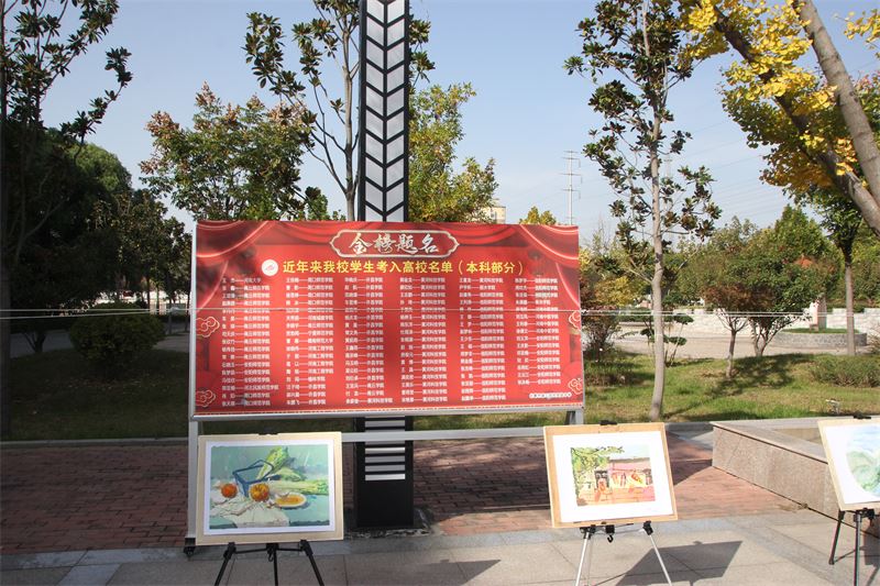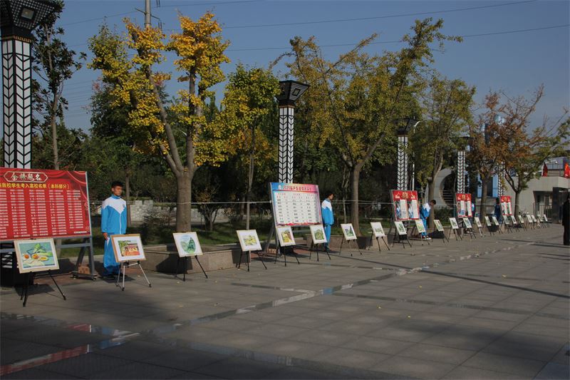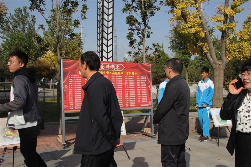 进入学校大门,视察组领导浏览了陈设在校前广场的优秀学生绘画作品和特色学科设置情况宣传展板;了解了学校优秀毕业生情况;查看了我校考入本科院校学子名单。