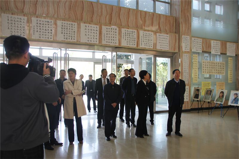 视察组领导到我校行政楼大厅实地考察学校毕业生优秀书画作品。