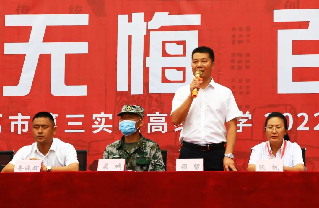 高一年级主任贾利军代表高中部全体师生对大力支持我校军训工作的全体教官表示热烈的欢迎和衷心的感谢,并向我校的2022级全体新生表示诚挚的欢迎!