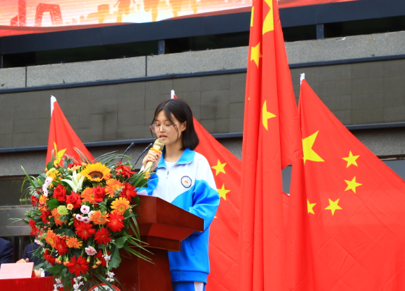 为激发每位学生的责任感、荣誉感和归属感,形成强烈的向心力与凝聚力,全校学生在高三(9)班王阳同学的带领下齐诵誓词: